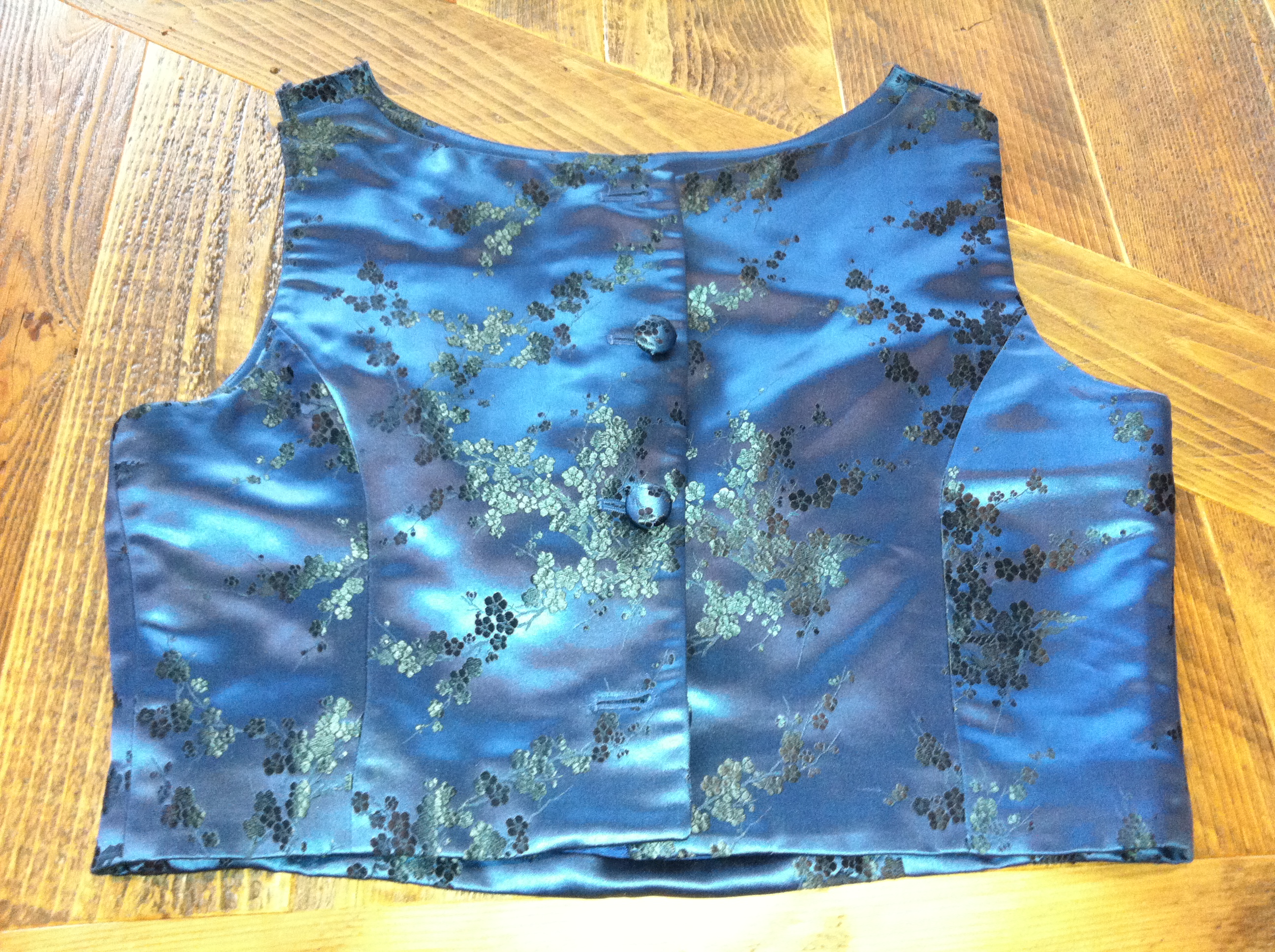 I found this beautiful blue satin vest with embossed flowers and a definitely oriental look languishing in a local thrift store. I was inspired to create June, a sophisticated evening purse with black pockets & straps, she maintains her unique oriental flare!