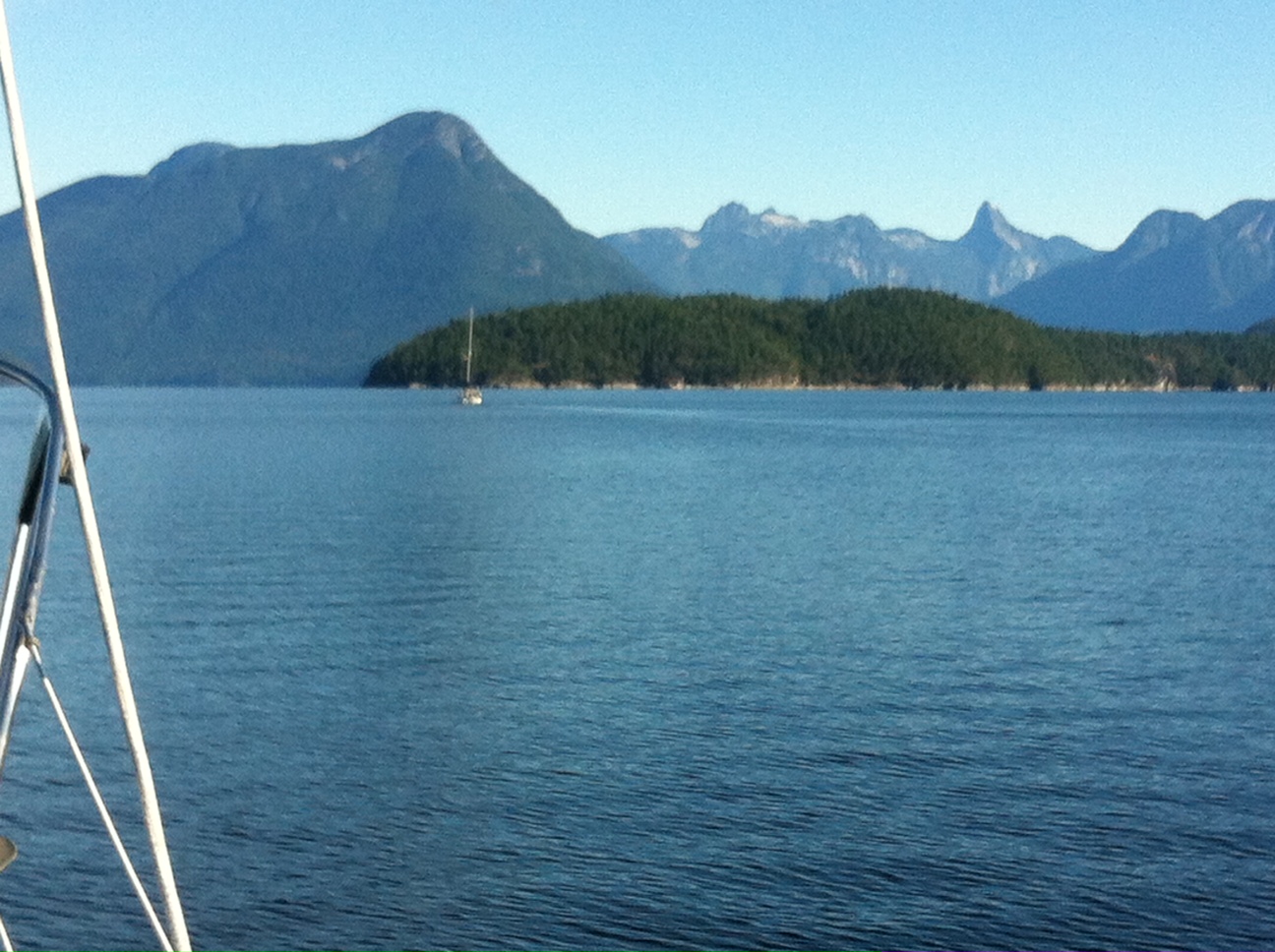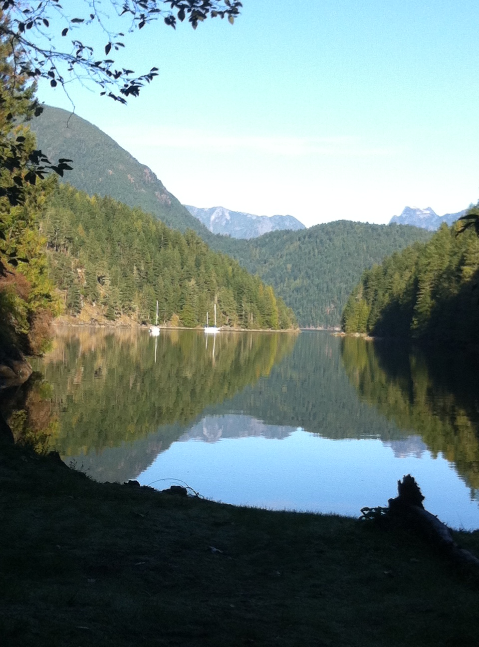 The next day we cross the Sound to reach Roscoe Bay on West Redonda Island. Again we are stunned by the huge expanse of icy blue water surrounded by majestic peaks. They tower before us, some rocky pinnacles still topped with snow, others rounded forest clad humps, shades of green & grey as they recede into the distance. It is a stunning panorama & we are lucky enough to have another vivid blue sky above us with a few small fluffy white clouds floating over the peaks. This is definitely ‘God’s country’ filling us with peace & serenity, & as Ron says ‘making us want to live for one more day’. Parsifal is glistening white in the morning sun, with last night’s dew slowly drying on the varnished wood. Her teak & brass glowing under the sun’s rays, she seems to be enjoying this journey as much as we are. Stripping off layers once again as the sun does her work, we enter Roscoe Bay, cliffs narrowing as we cross the shallow entrance only navigable at high tide. A sparkling waterfall cascades down into a small bay protected by forested hills & cliffs, we anchor & stern tie near the narrow entrance with a glimpse of Waddington channel & the forested bluffs beyond.