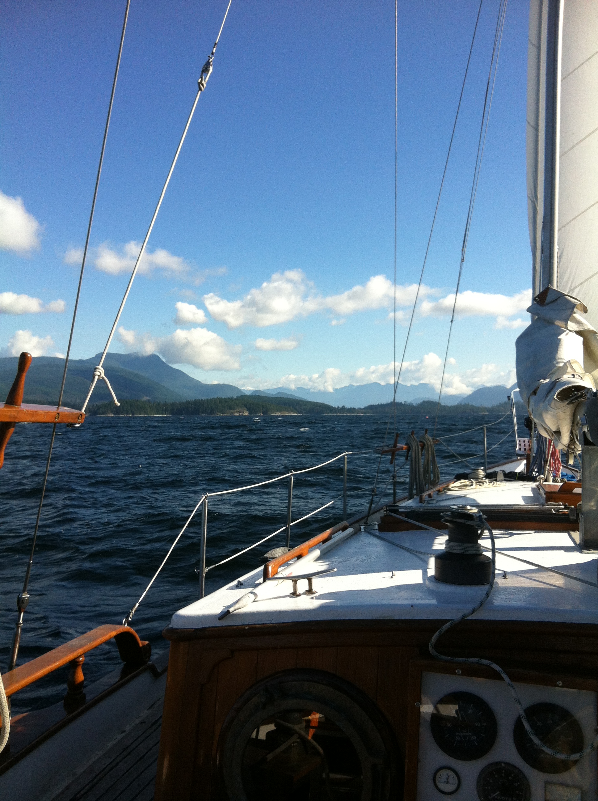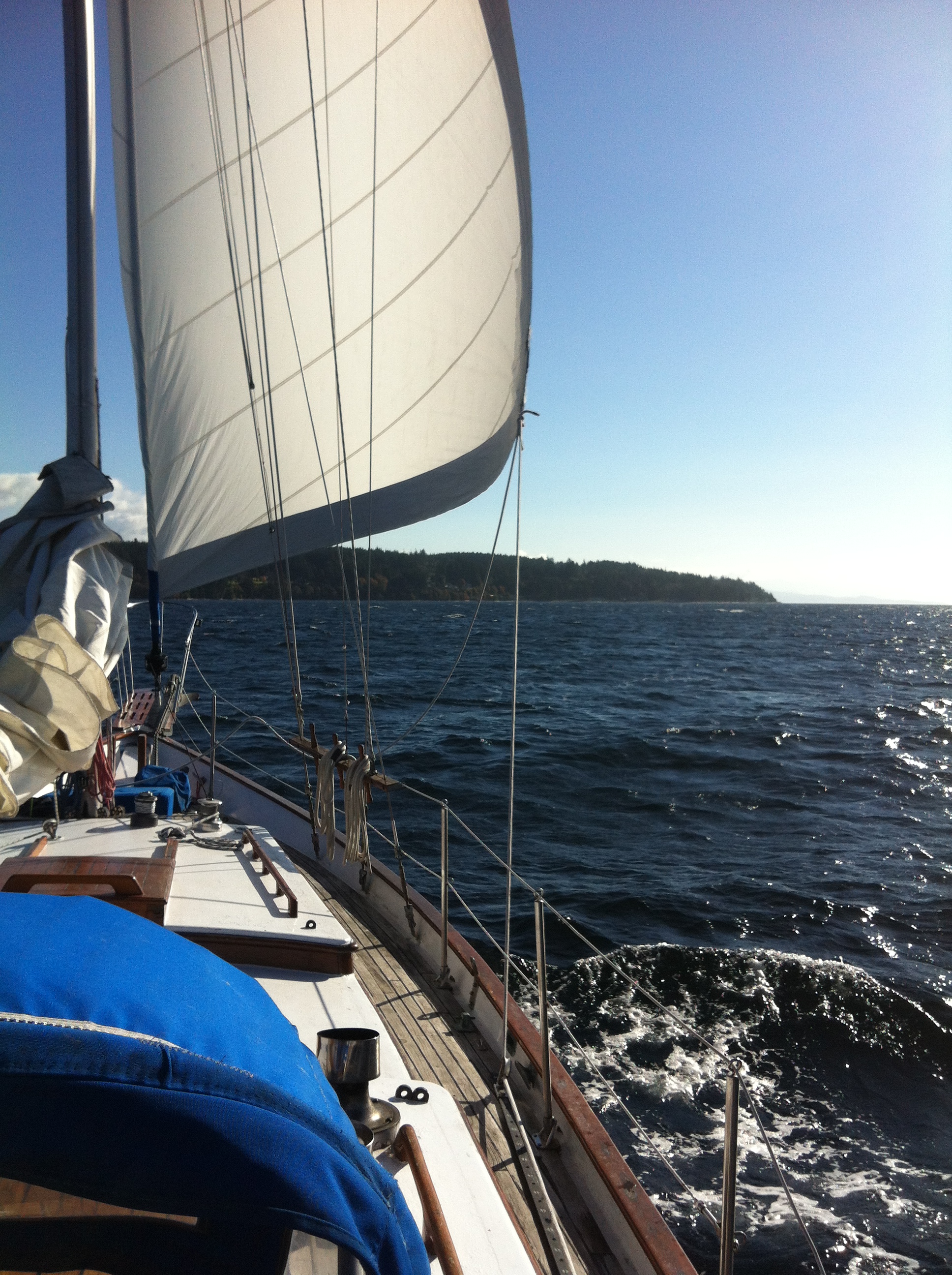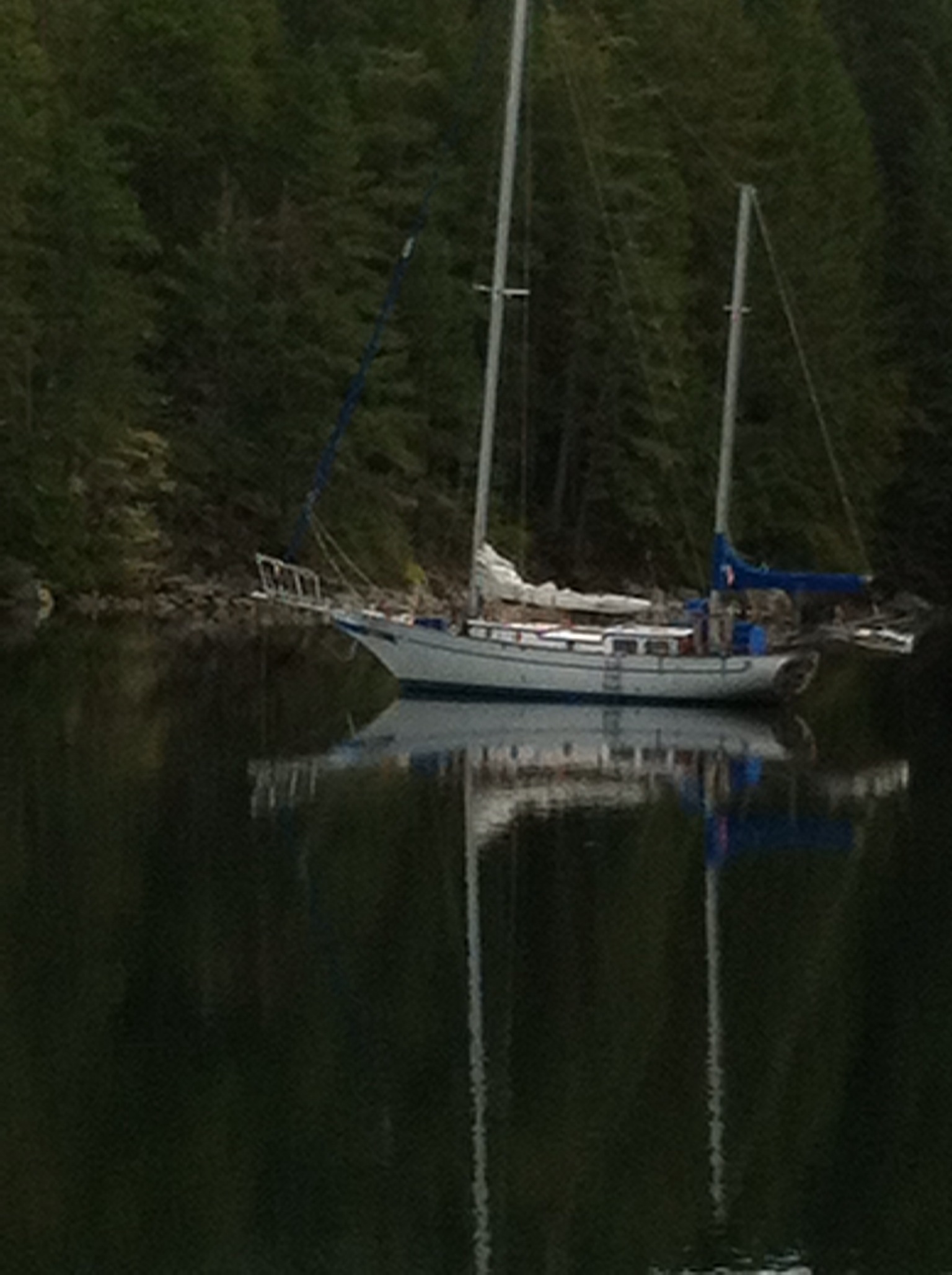 After two days exploring Powell River & two restless nights being tossed around in the harbor, we are happy to sally forth this morning & head south for more sheltered waters. We can feel that the wind is strong & see the whitecaps before we exit the harbor, but it isn’t until we leave the lee of the land that we take the full brunt of the north wind & experience the effect of the frothing furrows marching south. We must head SW in order to round Grief Point against the will of wind & water, rolling constantly with each set of waves. Once pointed south we can at least ride the wind & the waves to our next destination, Blind Bay. Malaspina Strait appears to enjoy testing our metal, and Parsifal once again rises to the task and keeps us safe at every turn.