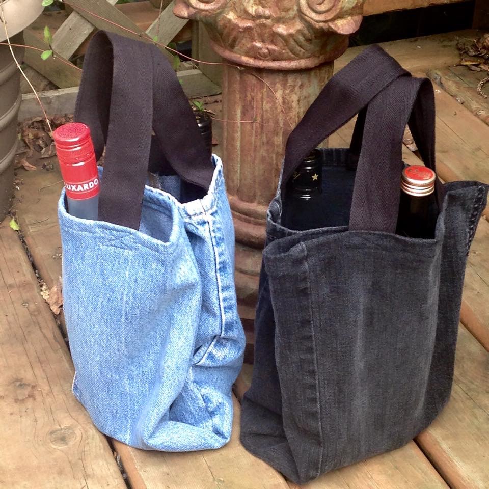 I love making recycled wine bottle bags from the legs of old jeans & cords.