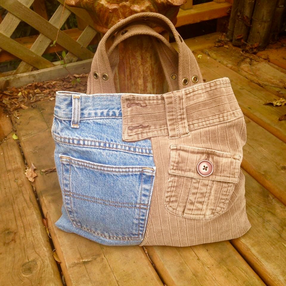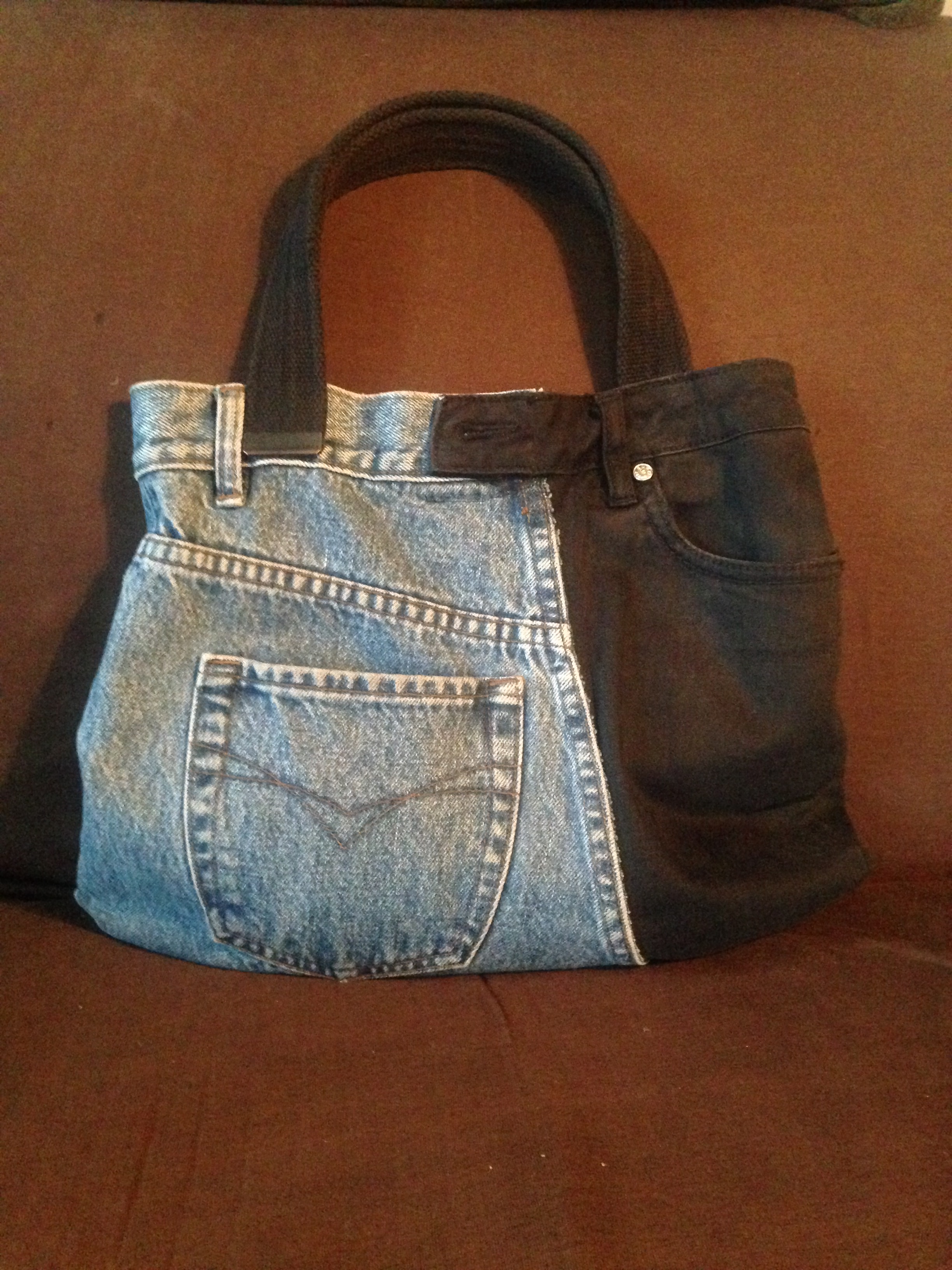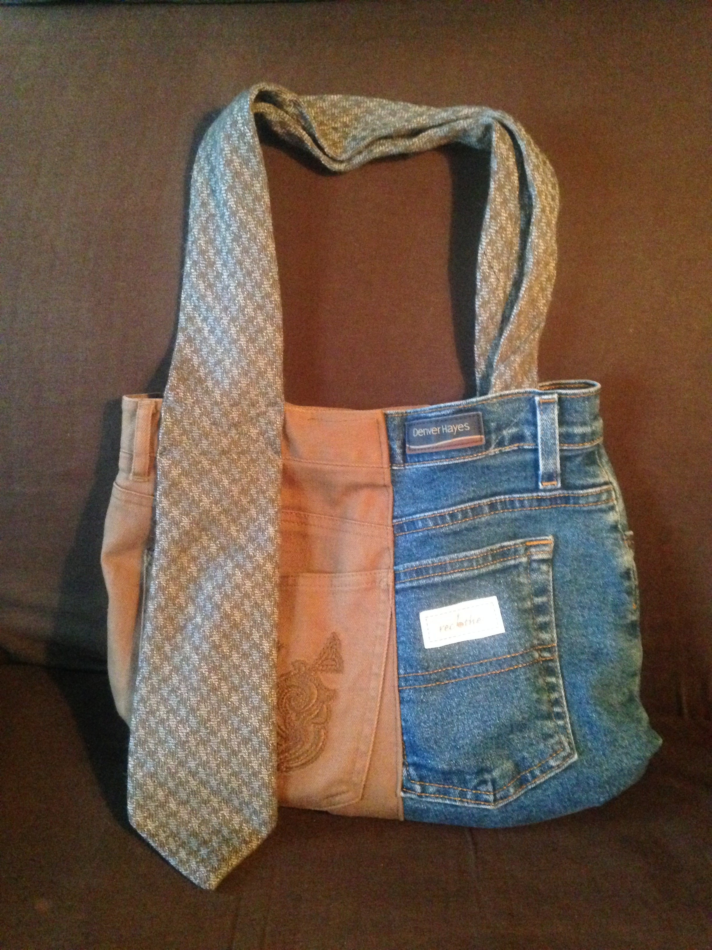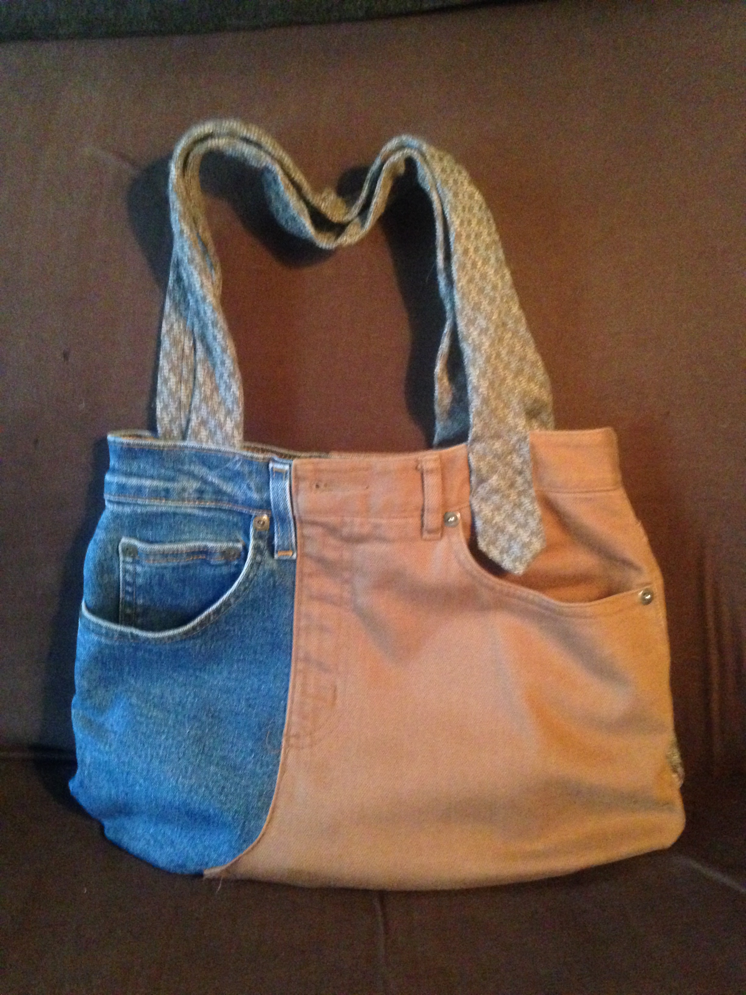 Here’s my tan & blue jean bag, I added the woven men’s tie for the handle, so I can wear it over my shoulder or just carry it…